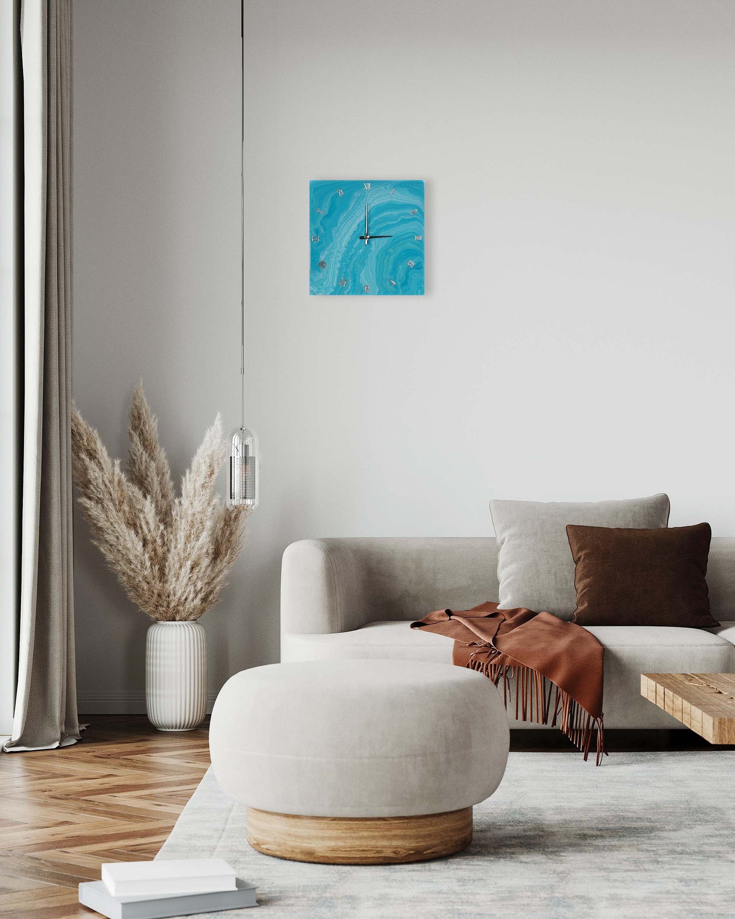 Oggetti e accessori in vetro o in legno sono l’ideale per completare l’atmosfera suggerita dall’orologio da parete in resina effetto marmo azzurro.